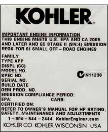 Identifying Kohler EnginesThe engine identification numbers (model, spec, and serial number) are on a silver decal normally affixed to the blower housing of the engine. These numbers should be provided to the dealer whenever parts are required.