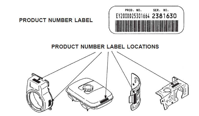 Robin Subaru Engines IdentificationRobin engines are identified by MODEL, SPECIFICATION, and CODE NUMBER. For each model there may be many different versions called specifications. Each specification will be unique in some way. The difference may only be the paint color or it may have a different type of PTO or some other significant difference. In order the identify the correct service part number, it is important to confirm the specification and code numbers for your engine. The specification and code number together are know as the PRODUCT NUMBER. All Robin 4 cycle engines have a Product Number label similar to the label illustrated below. The Product Number Label has a 15 digit alphanumeric string that consists of the SPECIFICATION (SPEC) number (11 digits) and the CODE number (4 digits). Please note the illustration below: |